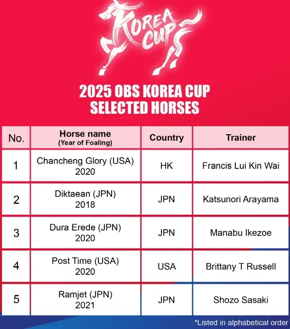 值得关注的是,中国香港赛驹"自强不息"(Self Improvement)与"禅胜辉煌"(Chancheng Glory)双双入选韩国此次赛马盛宴的候选阵容。