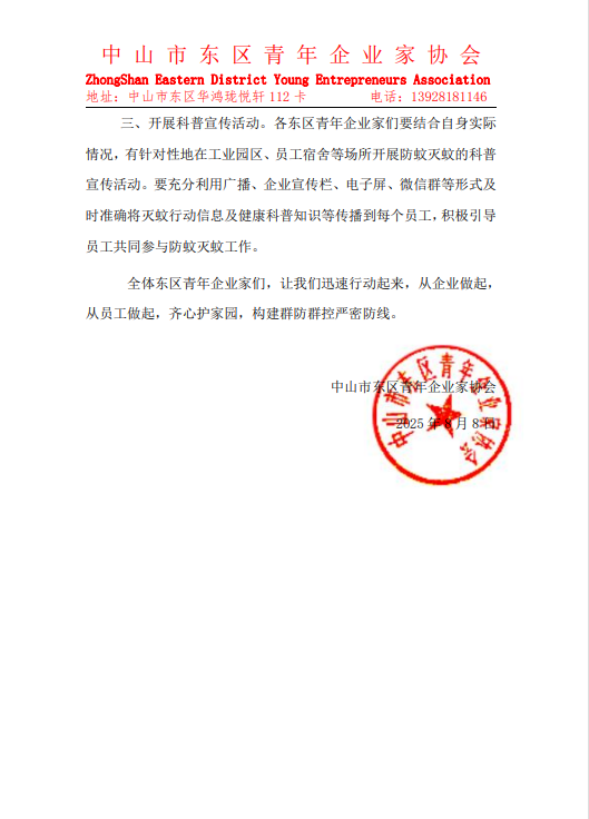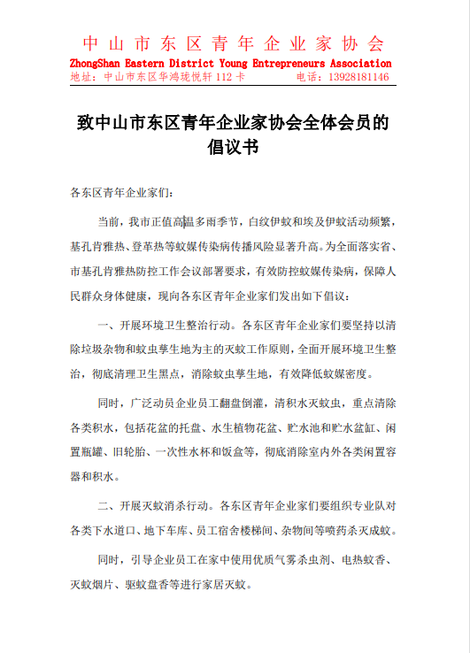 同时,东区青年企业家协会第一时间发布倡议书,号召青年企业家履行社会责任,自觉开展爱国卫生运动,并结合自身实际,利用企业宣传栏、电子屏、微信群等开展防蚊灭蚊的科普宣传。