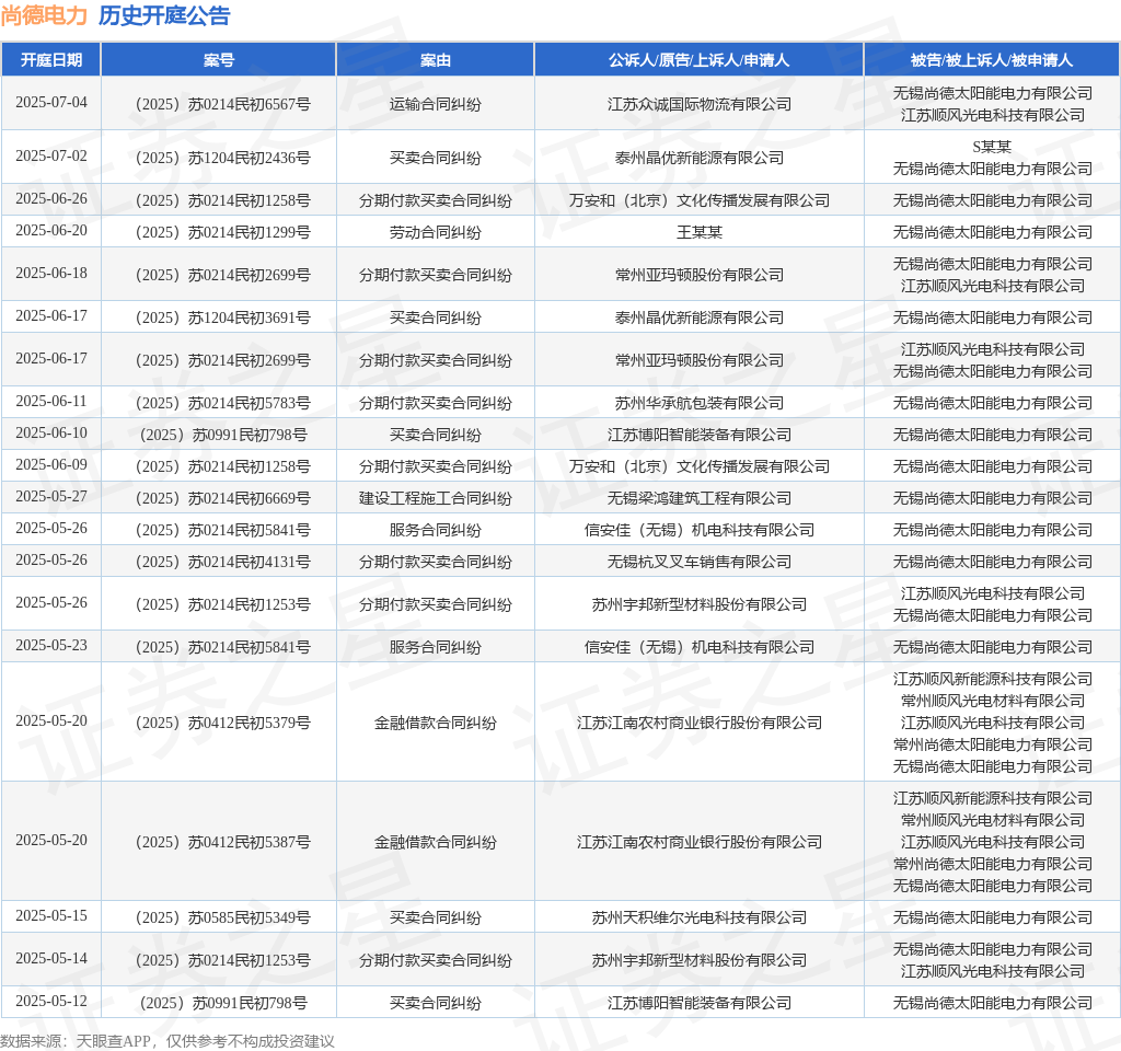 案号:(2025)苏0214民初1299号审理法院:无锡市新吴区人民法院案由:劳动合同纠纷当事人信息: 原告/上诉人:王某某 被告/被上诉人:无锡尚德太阳能电力有限公司开庭日期:2025年6月20日根据统计,近一年内以无锡尚德太阳能电力有限公司为当事人的历史开庭公告有53则,其中案由为“分期付款买卖合同纠纷”的公告以19则居首,其次为“买卖合同纠纷”有13则,“申请确认仲裁协议效力”有4则。历史开庭公告(前20条)如下: